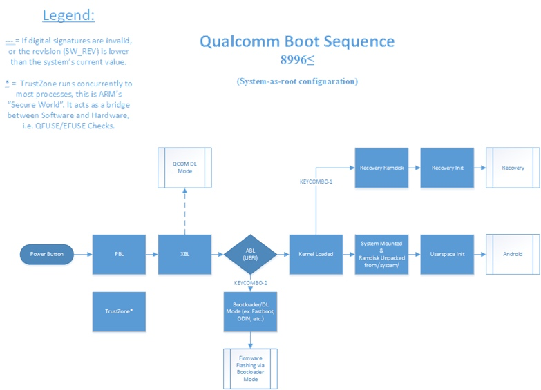 当我们按下电源键启动手机的时候,CPU 上电之后开始运行;它最开始运行的代码是 CPU 芯片厂商提供的,写死在某个只读存储上,这段代码一旦出厂便不可更改,我们通常称之为 BootROM 或者 PBL (Primary Boot Loader);PBL 的主要功能是上电自检并启动下一个组件 SBL(Secondary Boot Loader),现在被叫做 XBL (eXtended Boot Loader)。这个 SBL 主要是初始化一些硬件环境(如DDR, clocks 和 USB 等)和代码安全环境 (TrustZone),当然,最重要的还是验证并加载下一个组件——ABL(Android Boot Loader,也叫 aboot)。与 PBL 不同,SBL 程序一般存放在 eMMC 上,这个地方是可以被修改的,因此它可以被刷写和升级。正因如此,SBL 还承载着最底层的恢复设备的重任;我们常说的高通 9008 模式(全称 Emergency Download Mode)就运行在这里。9008 模式,本质上就是强制刷写设备的 eMMC 存储,因此不论你上层操作系统或者应用软件被破坏成什么样,除非硬件损坏,基本上都可以救回来。